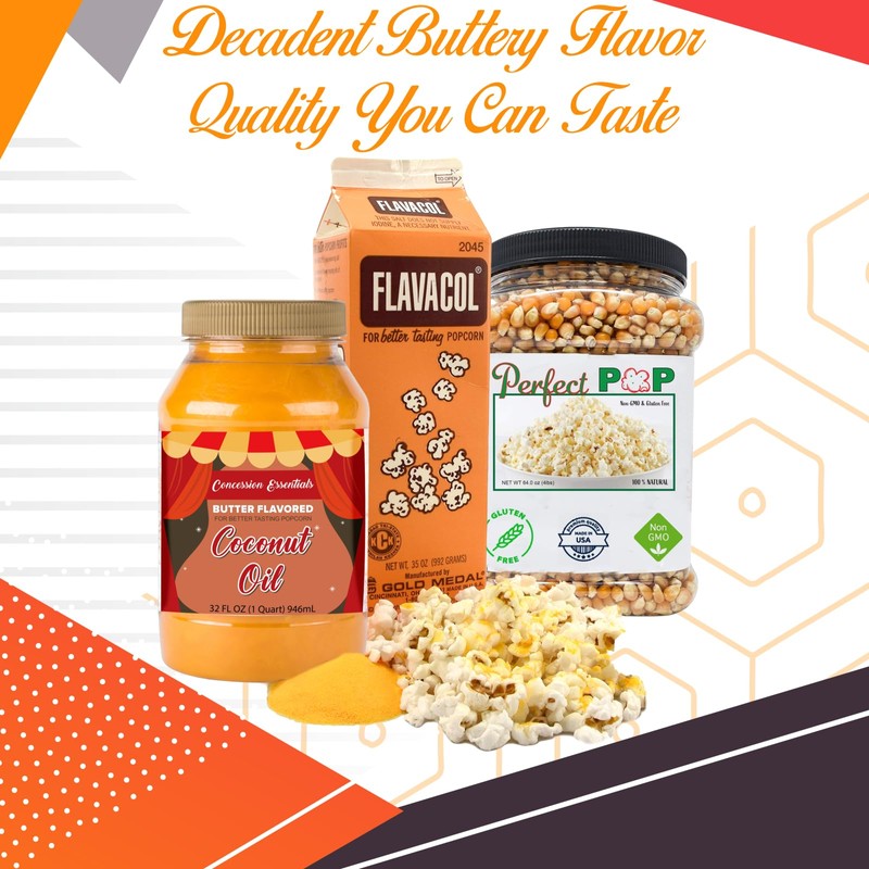 - The ultimate popcorn kit (includes 1ct-35oz carton of popcorn season salt, 1ct 32oz Buttery Flavored Coconut Oil and 4lb of Yellow Popcorn Kernels