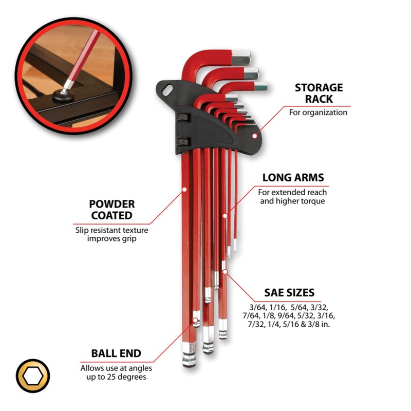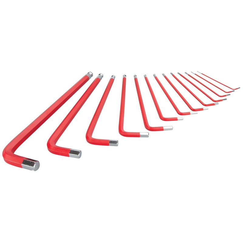 Performance Tool W80202 13 Pc. SAE Long Arm Hex Key Set - Ball End for Angled Use, Powder-Coated, Storage Rail, Laser-Etched, Red