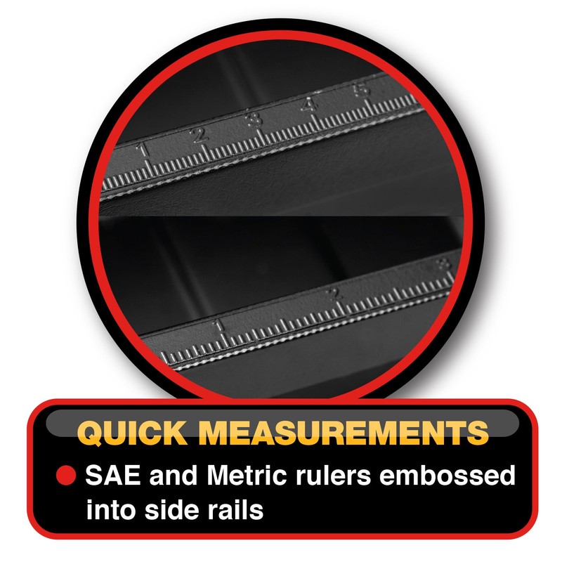 - QUICK MEASUREMENTS: SAE and metric rulers embossed into side rails
