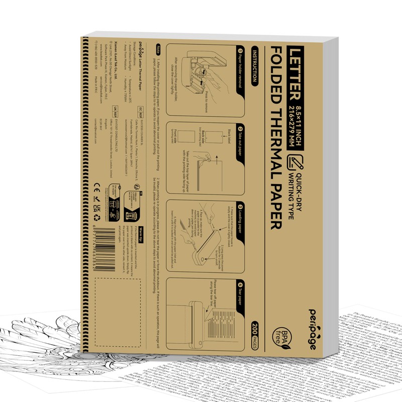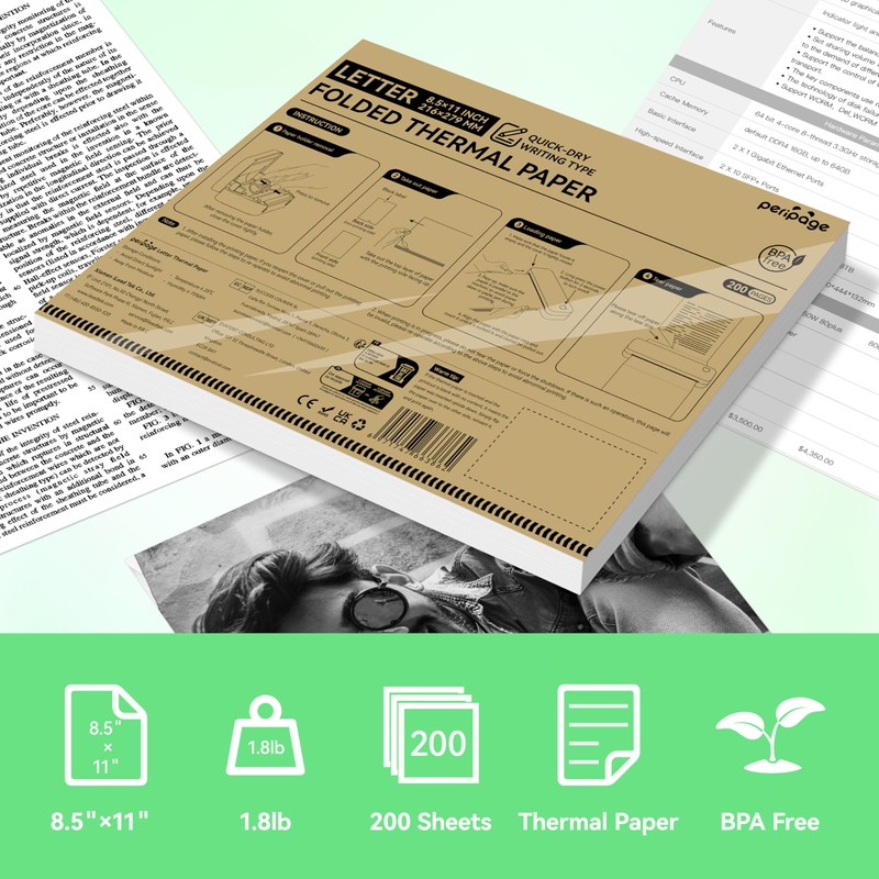PeriPage Thermal Printer Paper 8.5''×11'' US Letter 200 Sheets Quick-Dry Folded Thermal Paper for Portable Thermal Printer