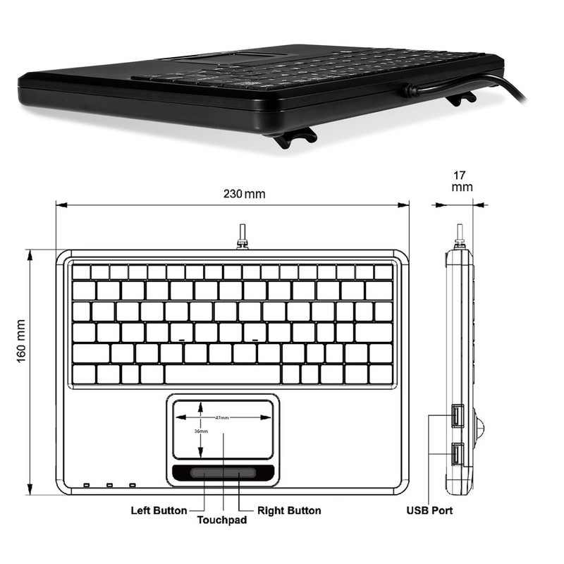 - Super Mini Wired Keyboard 230 x 160 x 23mm with 14mm Trackball