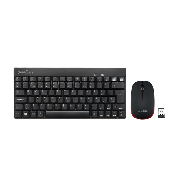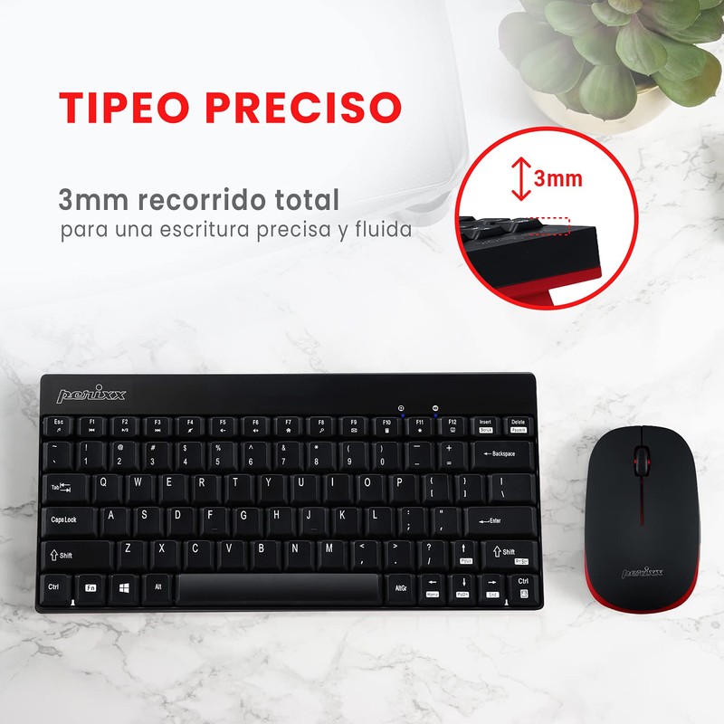 - Mini set inalámbrico: Periduo-712 es un conjunto de teclado compacto y mouse, viene con 80 teclas (291 x 138 x 20 mm), incluye un mouse óptico estándar de 1000 DPI (104 x 62 x 33 mm). El set cabe en el bolso de ordenador portátil. Tecnología Inalámbrica de 2,4 GHz, operativo hasta 10 metros de alcance. El teclado de configuración en español, permite tipear con facilidad las tildes y otros caracteres de la lengua española