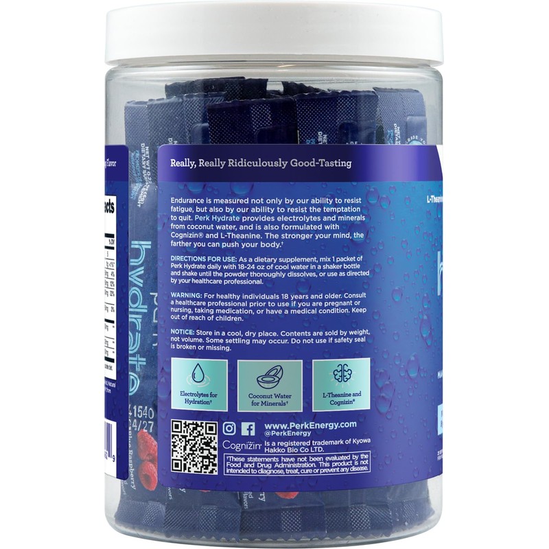 Perk Hydrate Electrolyte Stickpacks Blue Raspberry Flavored (20 Packets) - Coconut Water, CDP-Choline, L-Theanine, Gluten-Free