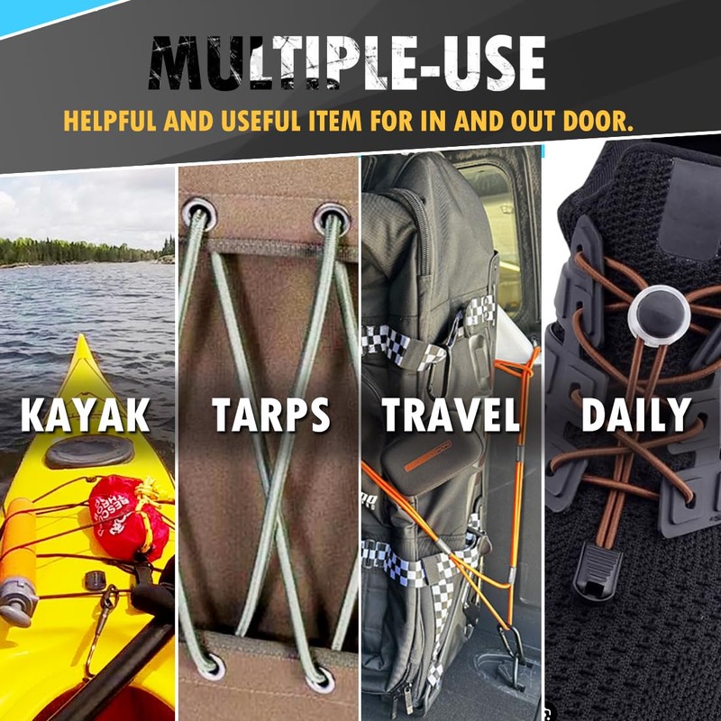 - 【MULTIPLE-USE】The bungee cord secures objects while cushioning vibration. Widely used for flexible connections. It works anywhere. Use it to secure objects such as tarps with sealing rings, hoses, wires, canopy, lashing, tents, RVs, and camping poles. It is a must-have and helpful item for both indoors and outdoors.