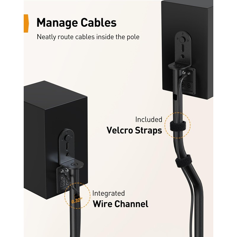 • Built-In Cable Management: Keep your home theater speakers looking neat and tidy by routing wires through the hollow poles. If the 0.32″ cable holes are too small for connectors or cables to pass through, the floor speaker stands include hook & loop straps to secure cables along the outside of the poles.