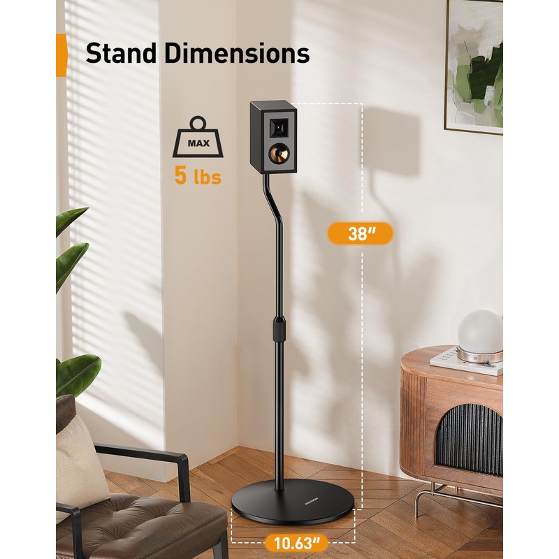 • Adjustable Height for Optimal Sound: Each height-adjustable speaker stand offers a height range of 28″ to 38″ to position your speakers at the perfect level for music and movies. The surround speaker stands feature ergonomic twist locks for smooth and easy height adjustment without the need for tools.
