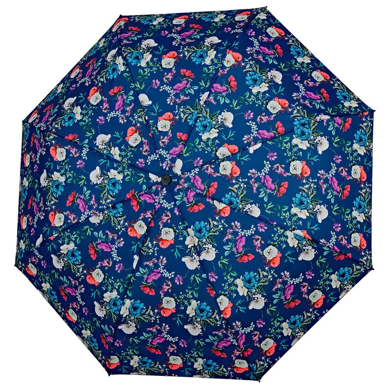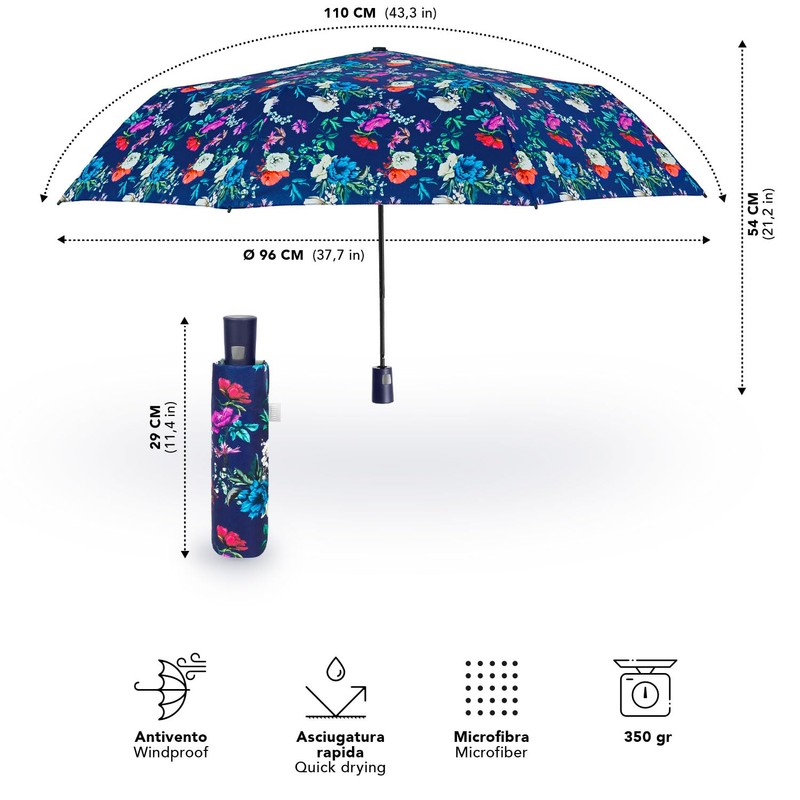 PERLETTI Multicoloured Automatic Umbrella for Women with Dots - Pocket Umbrella Compact Mini Lightweight Windproof - Rain Umbrella Small Travel - Diameter 96 cm, Blue with flowers