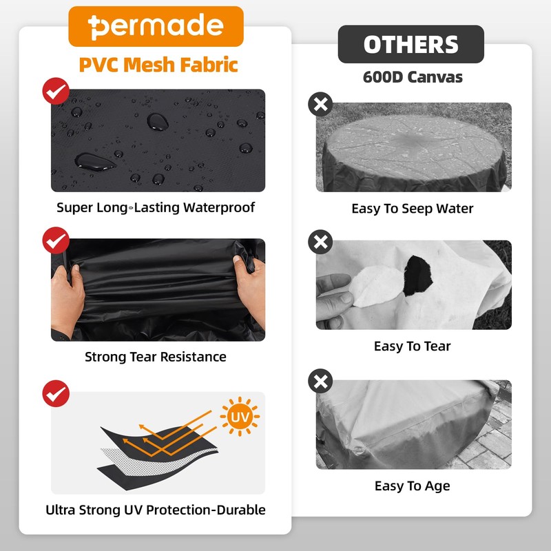 - 【Upgraded Protection】This outdoor fire pit cover is made of PVC mesh fabric, which is more durable than ordinary canvas material. There is a waterproof PVC coating on both the inside and outside, which has superior tear resistance, waterproofing and UV resistance. It resists fading and remains in excellent condition throughout all seasons