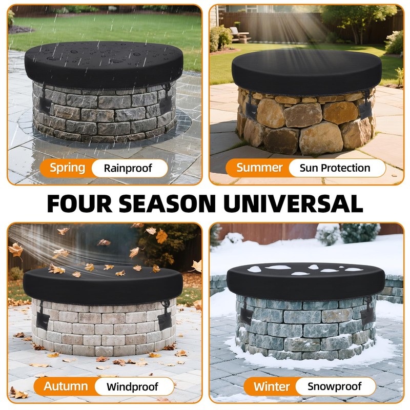 - 【Adjustable Opening for Versatile Fit】 The round built-in fire pit cover features an elasticized opening that adjusts from 64" to 71", making it compatible with firepits up to 71" in size. Please measure your stove beforehand to select the perfect fit
