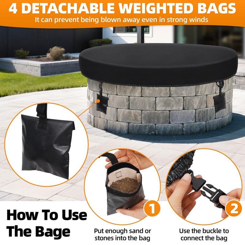 Adjustable Opening for Versatile Fit: The round built-in fire pit cover features an elasticized opening that adjusts from 64" to 71", making it compatible with firepits up to 55" in size. Please measure your stove beforehand to select the perfect fitWindproof Design:This fire pit cover features 4 sandbags that can be filled with heavy objects like sand or stones to add weight and prevent it from being blown away by strong winds. Elastic rolled edges can better fit tightly with the fire pit, providing dual protection