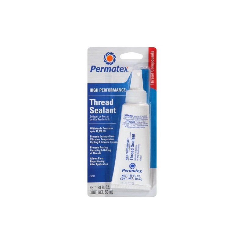 Permatex High Performance Thread Sealant 50 ml (56521)Permatex High-Performance Thread Sealant (56521) is engineered to prevent leakage from vibration, temperature cycling, and extreme pressures. This advanced formula protects threads from rust, corrosion, and galling, ensuring a secure and durable seal in various applications. This high-performance thread sealant is perfect for automotive and heavy-duty uses, including stainless steel fittings, head bolts, oil and coolant lines, fuel fittings, and more. Parts are repositionable after application, with the sealant fixing in approximately 4 hours and fully curing within 24 hours. Specifications and Dimensions Color: White. Volume: 50 ml. Item Weight: 1.76 ounces. Product Dimensions: 8 x 3 x 2 inches. Item Form: Liquid. Style: Compact. Key Features and Benefits Prevents leakage from vibration, temperature cycling, and extreme pressures. Protects threads against rust, corrosion, and galling. Parts repositionable after application, ensuring flexibility. Ideal for automotive, motorcycle, and heavy-duty applications.