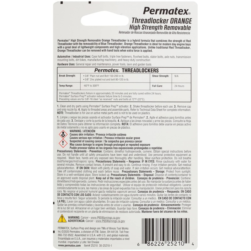 Permatex 25210 High Strength Removable Threadlocker Orange Liquid, 10 ml