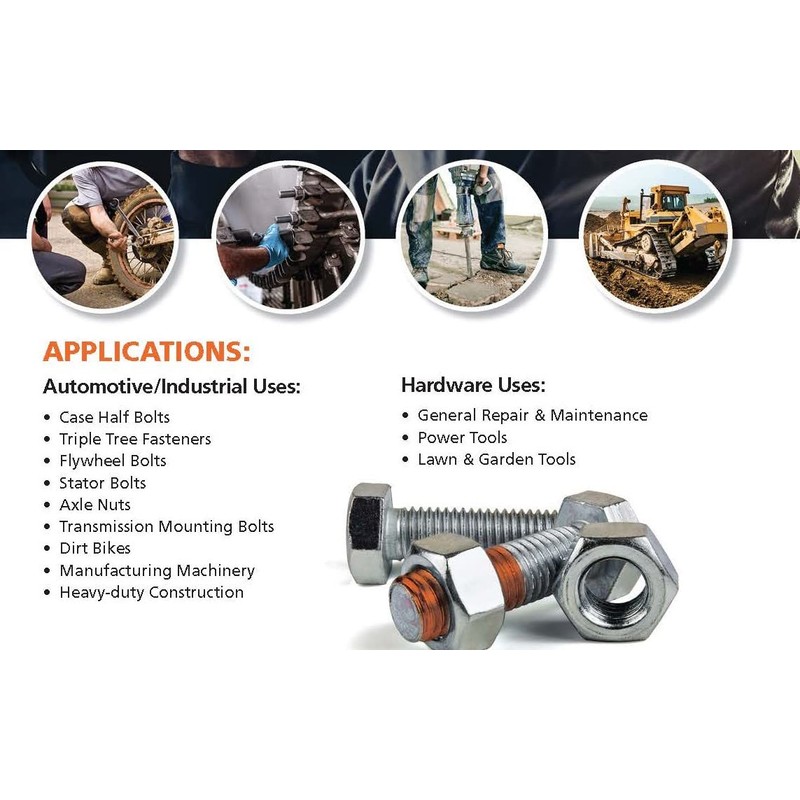 - Orange Thread locker can be removed with hand tools and does not require heating to achieve removal