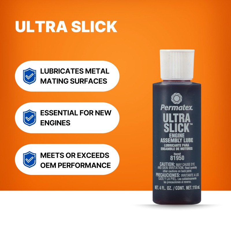 Permatex Ultra Slick Engine Assemly Lube adheres to component surfaces to prevent scuffing and galling during initial start-up. Proper lubrication of metal mating surfaces is essential prior to starting a new or rebuilt engine. This high quality formulation meets or exceeds OEM performance specs for engine assembly lubricants. From special-mission, job-specific lubricants, protectants and dressings, to the rigors of heavy-duty needs, count on Permatex to bring you reliability and problem-solving solutions that extend the life of your equipment.
