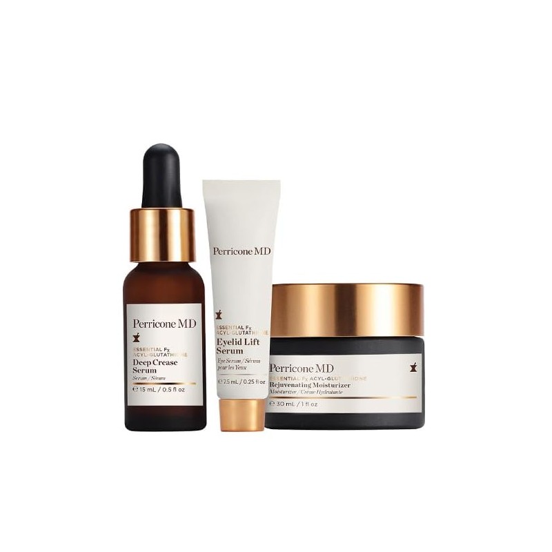 Essential Fx Acyl-Glutathione: Deep Crease Serum (0.5 fl oz / 15 ml) - A highly potent serum with a silky, luxurious texture to smooth even the most stubborn, deep-set lines, wrinkles and creases, including marionette lines, frown lines, smile lines and nasolabial folds. Essential Fx Acyl-Glutathione: Eyelid Lift Serum (0.25 fl oz / 7.5 ml) - Give your eyelids a lift with a powerful, yet ultra-lightweight tightening serum that visibly smooths and lifts droopy eyelids while diminishing the look of dark circles under eyes. Essential Fx Acyl-Glutathione: Rejuvenating Moisturizer (1 fl oz / 30 mL) - A deeply hydrating, fast-absorbing, skin firming moisturizer that delivers the optimal nourishment to strengthen and replenish skin’s moisture barrier for plumper, firmer-looking skin.