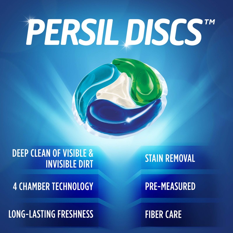 Persil ProClean DISCS laundry detergent with 4 powerful chambers. Each pre- measured DISC detergent capsule combines powerful stain removal, long-lasting freshness, fiber care, and the original deep clean detergent for a powerful cleaning combination. Persil DISCS are formulated to dissolve in all water temperatures and for use with whites or colors. Persil Discs are easy to use, just place the laundry pacs into your empty washing machine drum before adding laundry. Simplify your laundry routine with easy-to-use DISCS detergent for a truly deep clean. It's more than clean, it’s Persil ProClean!