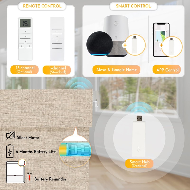 - 【Motor & Charger & Remote Control】With Li-ion rechargeable battery, the motorized shades can be used for 4-6 months after full charged. You can use USB-C plug charging cable or choose our solar pannel, it is much more safe and applicable. The included 1-channel remote allows for precise control of your motorized shades without needing to approach the window. Choose the optional 15-channel remote to simultaneously manage up to 15 different blinds for ultimate convenience and efficiency.
