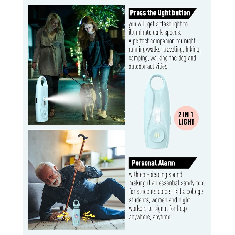 • [2 IN 1 LIGHT]: A personal protective device equipped with 2 high-intensity strobe lights that can disorient an attacker's vision, press the light button, and you will get a flashlight to illuminate dark spaces. A perfect companion for night running/walks, traveling, hiking, camping, walking the dog and outdoor activities
