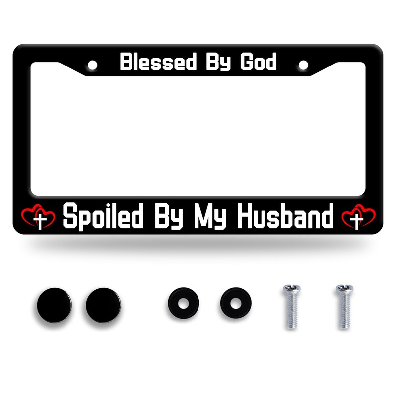 Personalise Blessed by God Spoiled by My Husband License Plate Frame Spouse Car Universal Stainless Steel Accessories Cars Decor with 2 Holes and Screws Fits Standard Us Vehicles 12.2 X 6 Inches