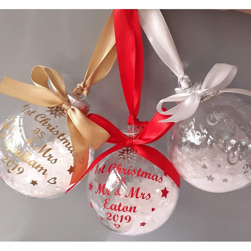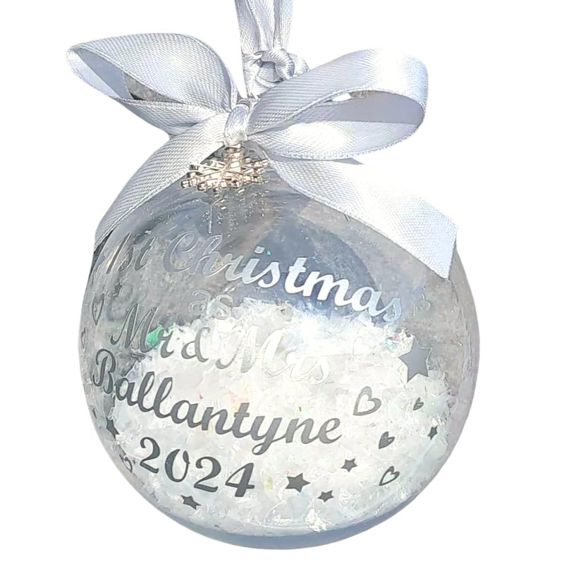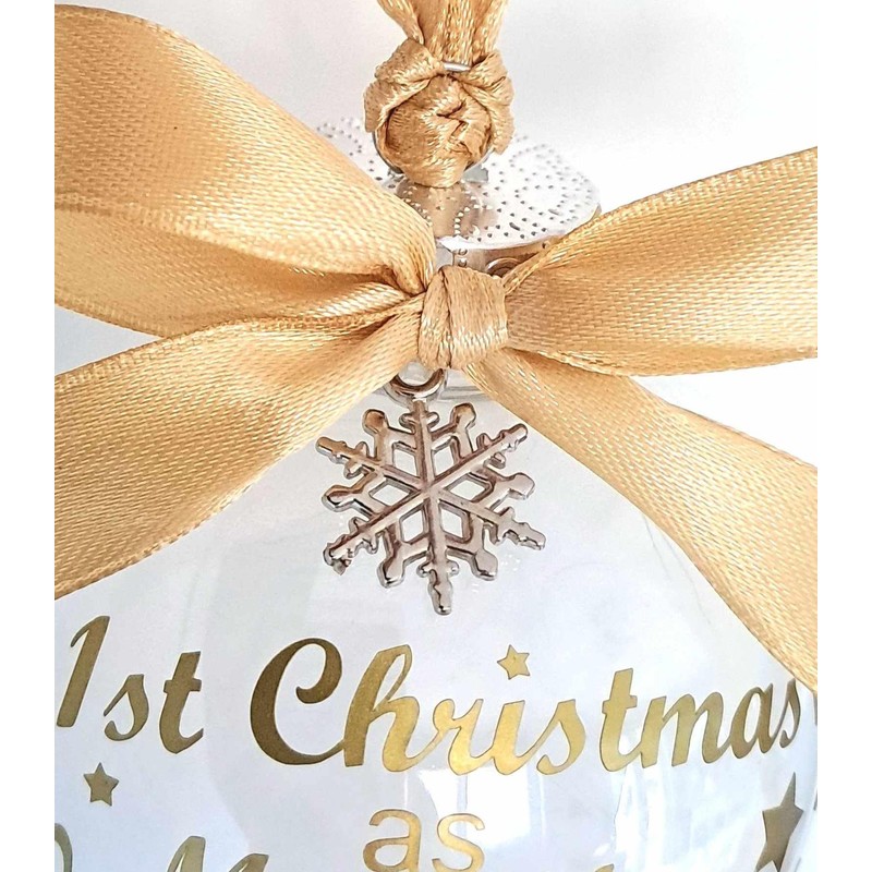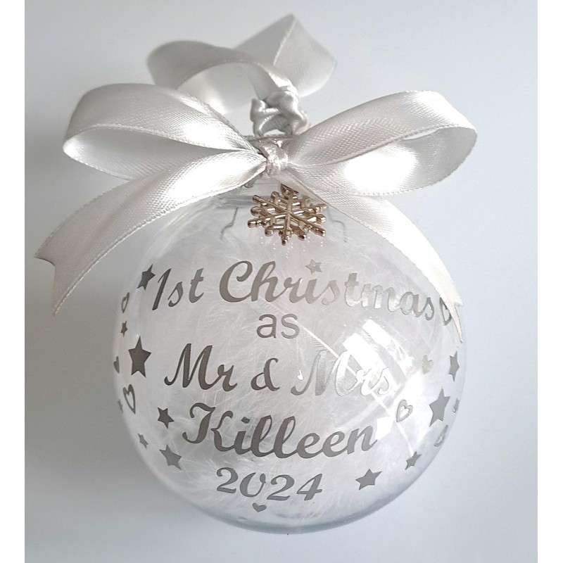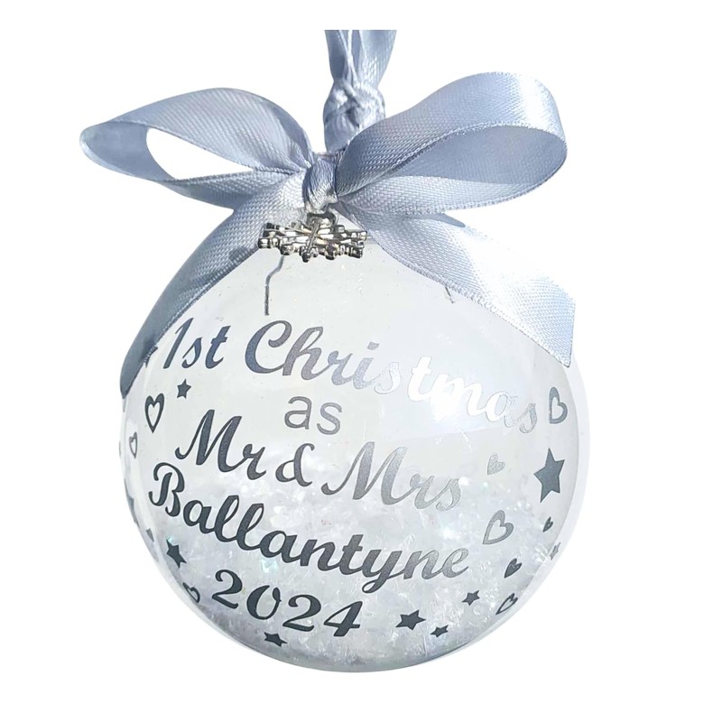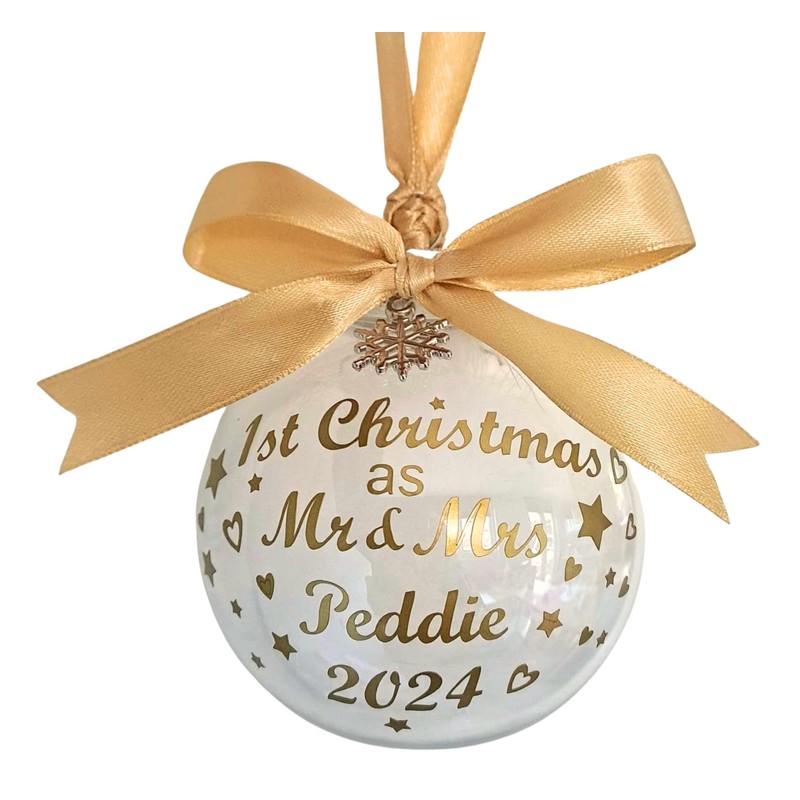 Personalised Bauble - First 1st Christmas 2024 as Mr & Mrs/Mr & Mr/Mrs & Mrs. Ribbon/Print available in Red, Gold, Silver, Pink, Blue