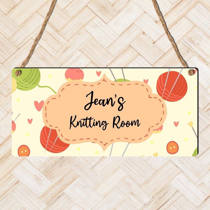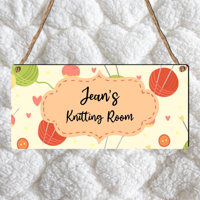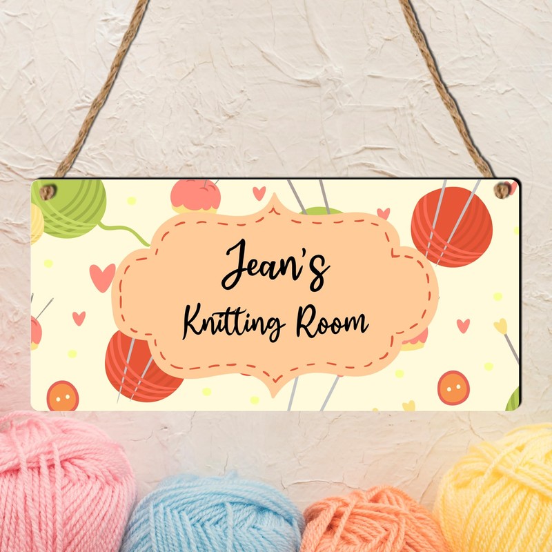 • 🧶 Customisable Knitting Room Décor: Personalise your crafting space with this delightful "Knitting Room" sign, featuring your chosen name. It's the perfect way to make your knitting area truly your own and showcase your love for the craft.