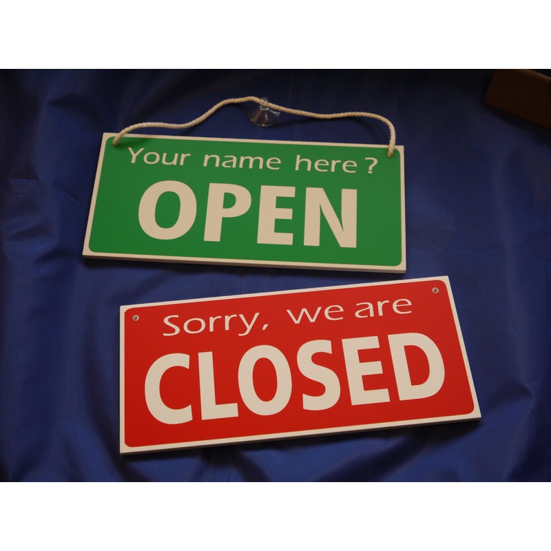 Order before 2pm and we will post the same day. These professionally made double sided Open / Closed signs are manufactured using a 6mm thick rigid white plastic. Due to the way they are made we can offer virtually all the common background colours but all have to have white lettering. The signs measure 220mm X 100mm and are supplied with a hanging cord and window sucker to allow you to position them anywhere that suits you. As these signs are ALL custom made to order, please make sure you include the wording you want across the top and your colour required when ordering. If no colour choice and wording is given we will supply a standard red / green sign as featured in the first photo. If you have any problems or for more information you can contact us on 01773 743399, sales@douglasdesign.co.uk or by using the contact seller form.