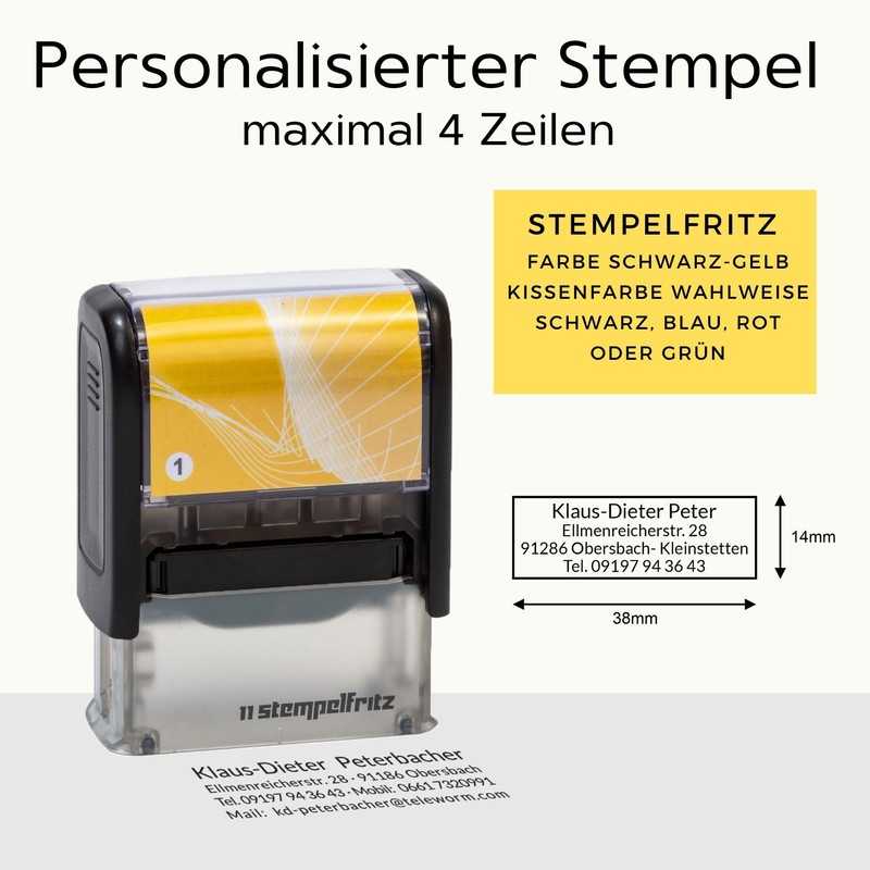 Personalised Stamp stempelfritz Black/Yellow / Address Stamp with Personalised Text Including Ink Pad for Designing - 38 x 14 mm / 4 Lines (Size 1)
