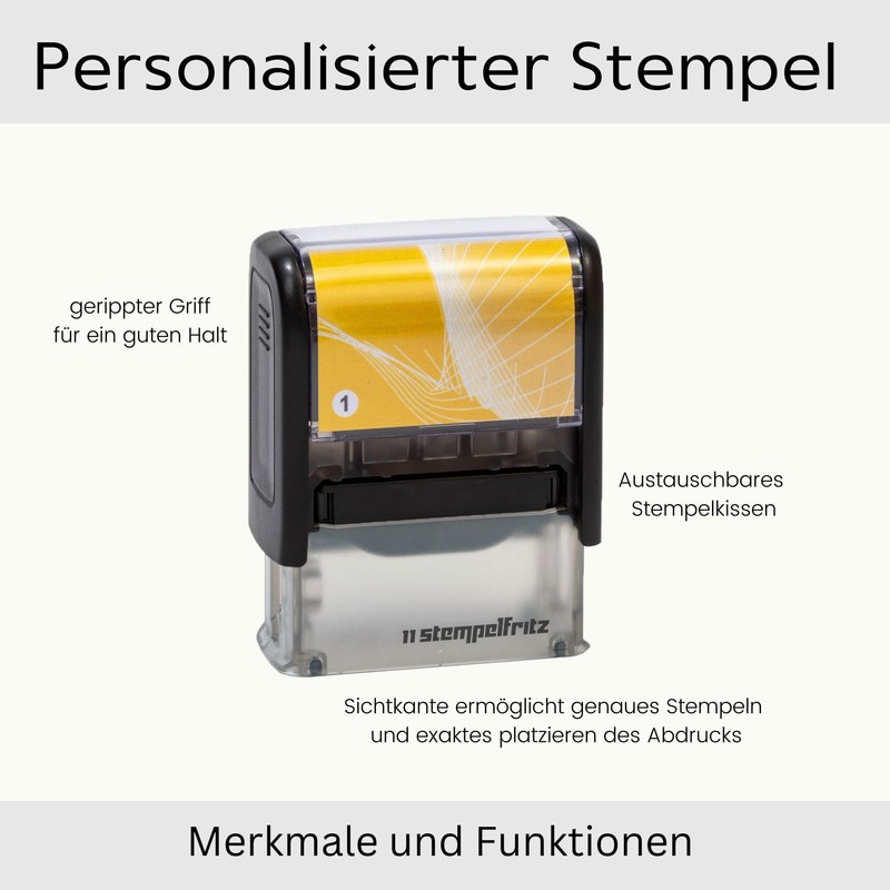 - Whether as an address stamp, name stamp or company stamp, you can design your own stamp according to your needs including name, address, telephone, mobile number, e-mail, tax number, bank details and much more.