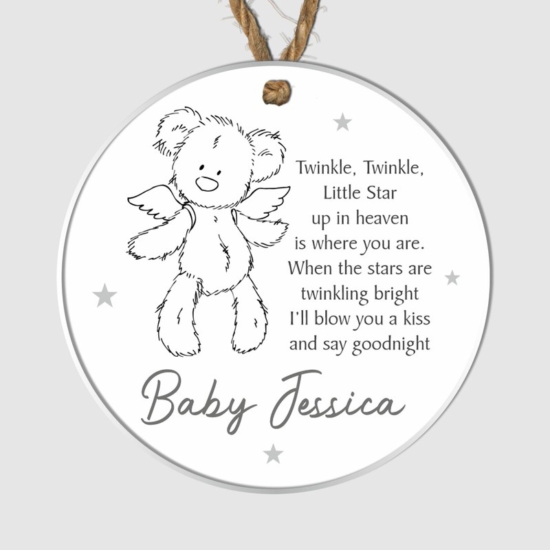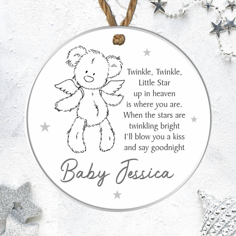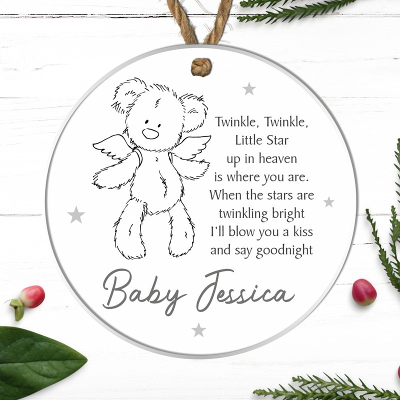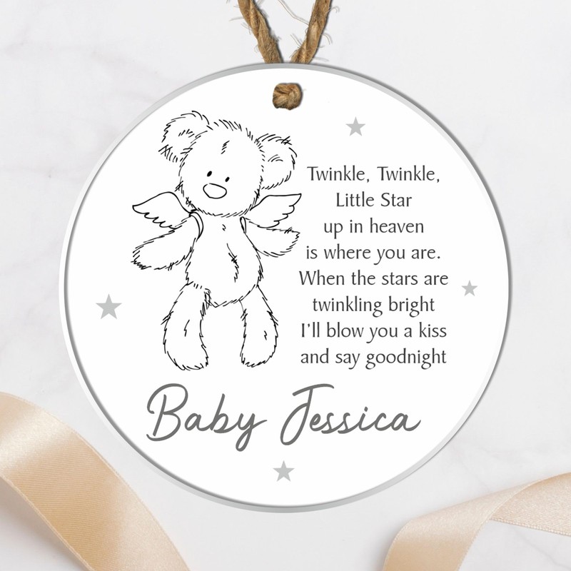 "Personalised 'Twinkle, Twinkle Little Star' Baby Memorial Bauble Plaque - Custom Angel Teddy Keepsake Ornament (White background, Acrylic Indoor & Outdoor Use 9cm x 9cm)
