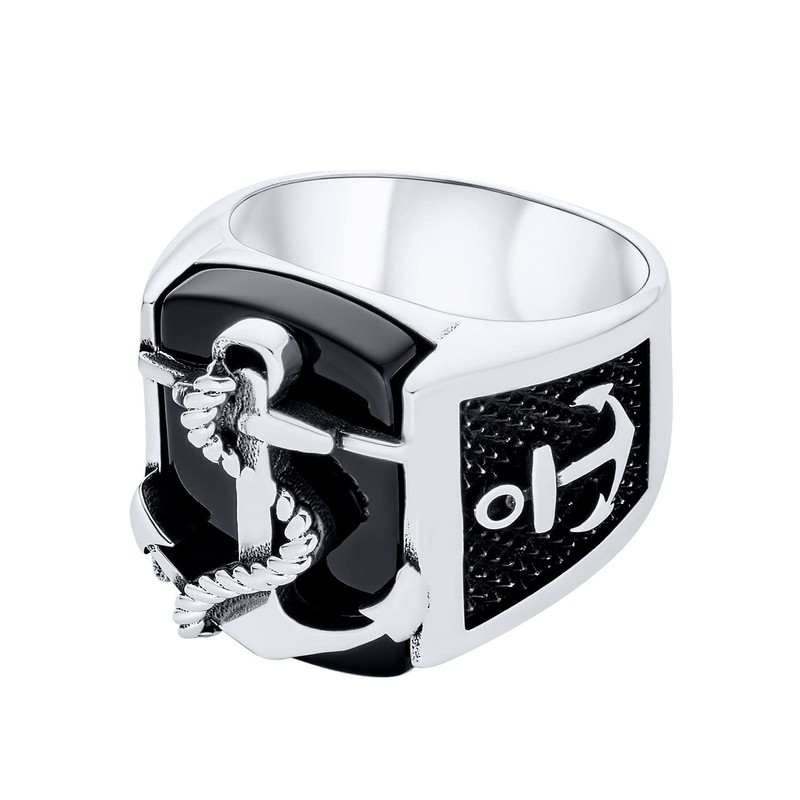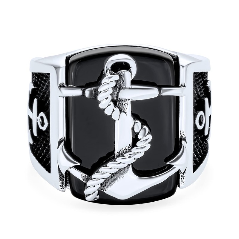 - A bold Anchor covers the center onyx stone. Two more anchor over mesh extends along shank complimenting the large anchor and the combination finish ring. Ideal accessory for navy, crew, sailor & pirate! Why not engrave names, inspirational message, letters, numbers, date, coordinates or medical information. Ring is hypoallergenic, anti tarnish resistant, nickel-free, lead-free,.
