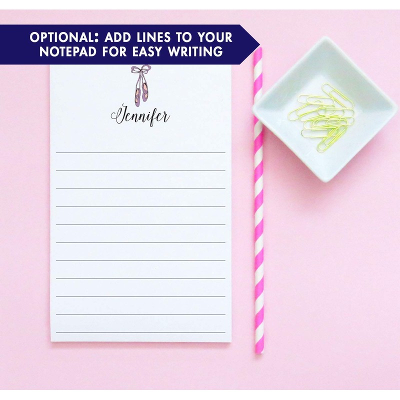 Ballerina slipper notepad with name printed in calligraphy. Perfect to have for jotting down notes, writing grocery lists or messages. Makes a great gift for birthdays, holidays and graduation.