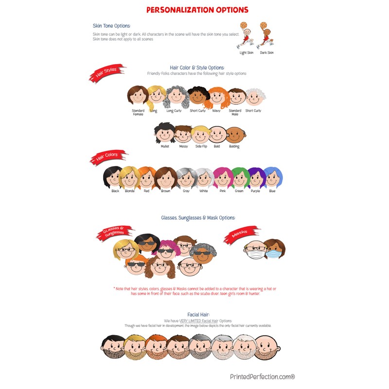 â ¿ Most ADULT characters can have a hair style, glasses or sunglasses &/or a mask added. Hair color is available in black, brown, blonde, red, grey and bald. Please see graphic for details.