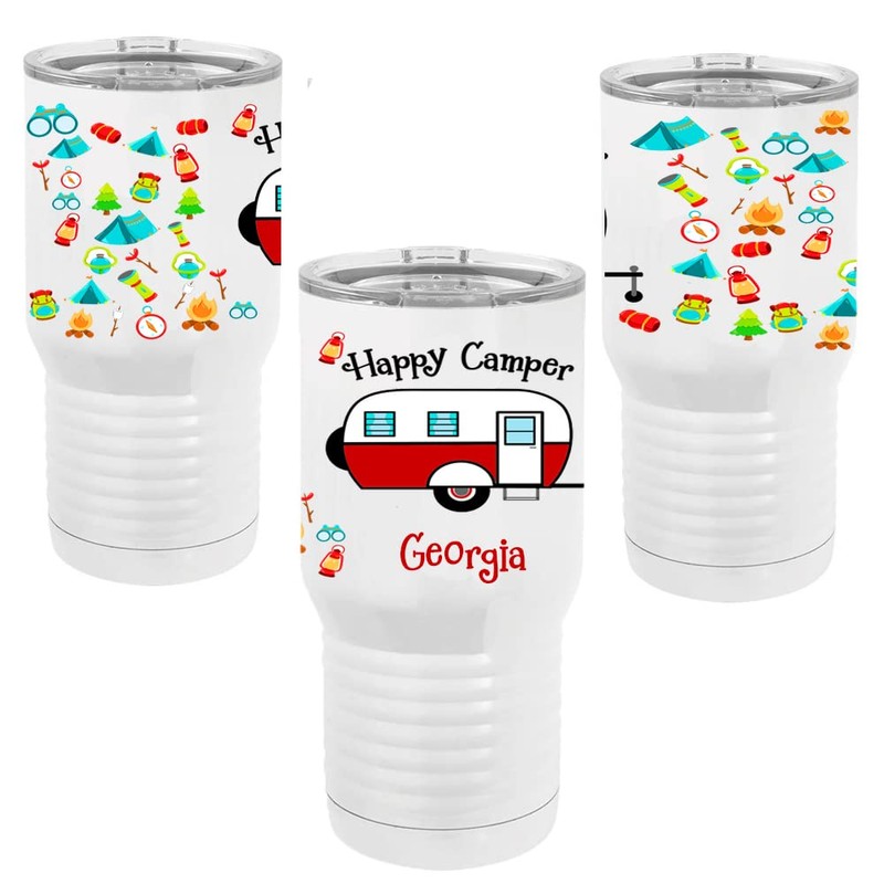 Personalized Happy Camper Tumbler Travel Mug - RV Travel Camper Drink Holder Cup with Custom Name