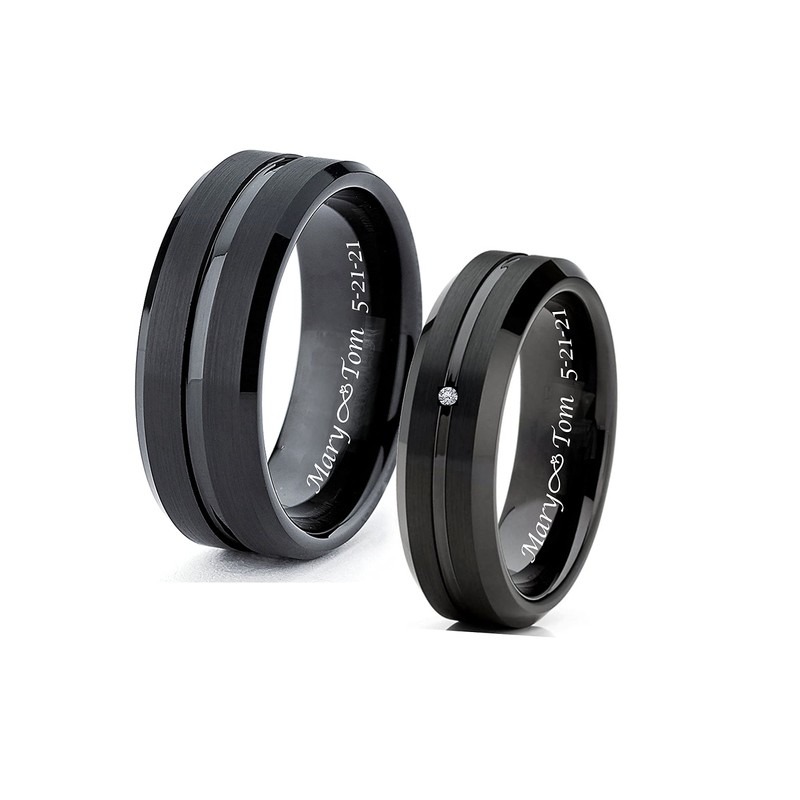 Personalized Lined Black Tungsten Ring Set Custom Engraved Free In Any Language - Wedding Bands - Couple's Ring Set - Ships from USA