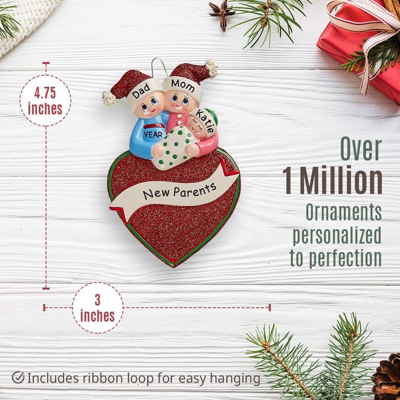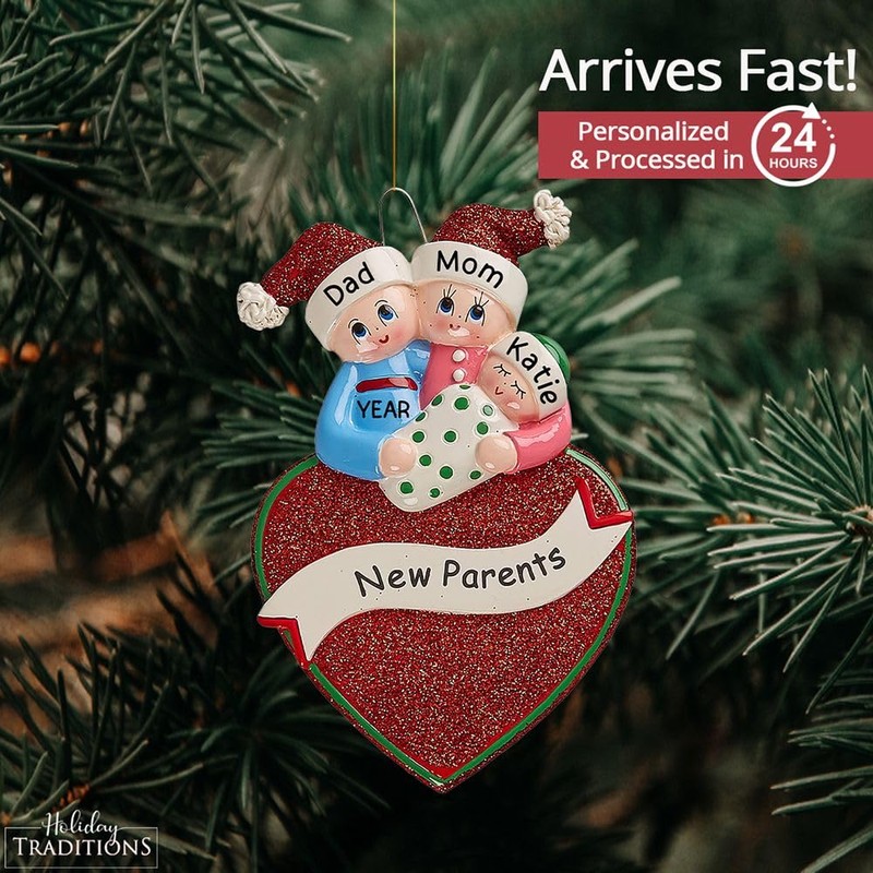 Personalized New Parents Ornament 2024 β Fast & Free 24h Customization β First Christmas As A Family of 3 for Tree β Custom Gift Wrapped New Mom and Dad Heart Keepsake for New Parents