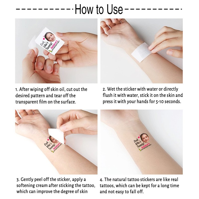 - đăCustom Temporary Tattoo Processă(1) Select the custom temporary tattoo design you want. (2) Click "Customize Now". (3) Upload your photo, name and age to customize. (4) Click "Add to Cart". We have received your custom temporary tattoo order and will produce and ship it as soon as possible.