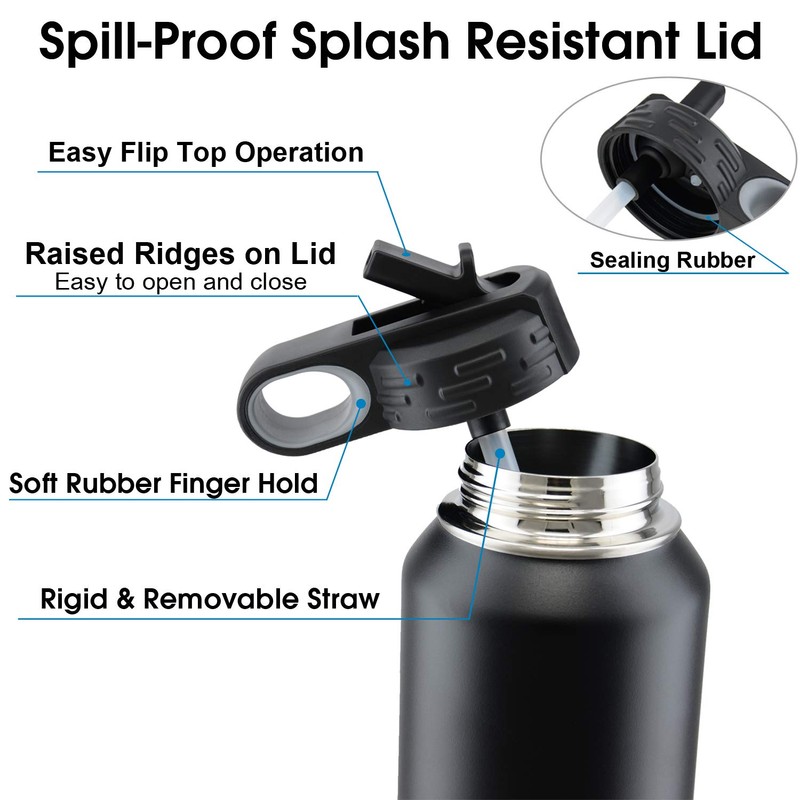 - Bring your unique water bottle with you anywhere you go. The spill-proof splash resistant lid includes sealing rubber which will stop any leakage, as well as an easy flip flop operation, a raised ridges on the lid which makes it easier to open and close. It also has a soft rubber finger hold and a rigid and removable straw.