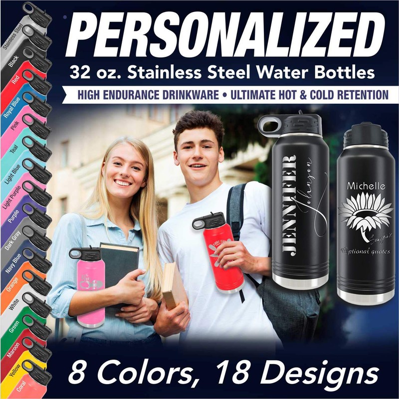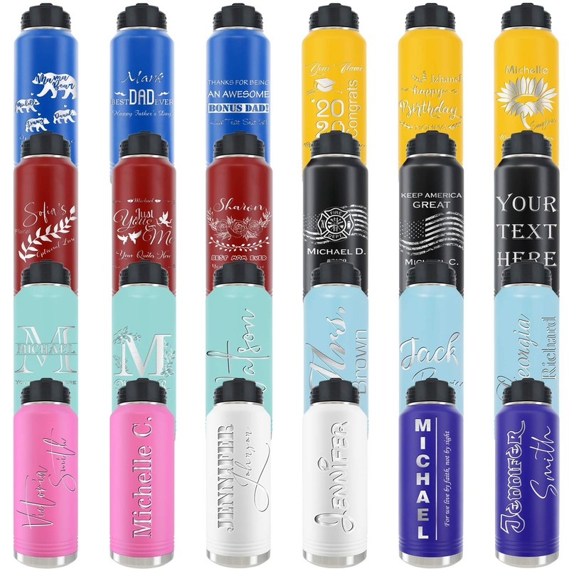 - Get your personalized water bottle by pressing “customize now”, it can be engraved from both the front and back side of the water flask. Designed and engraved in the USA. 9 different colors and 18 designs are available.