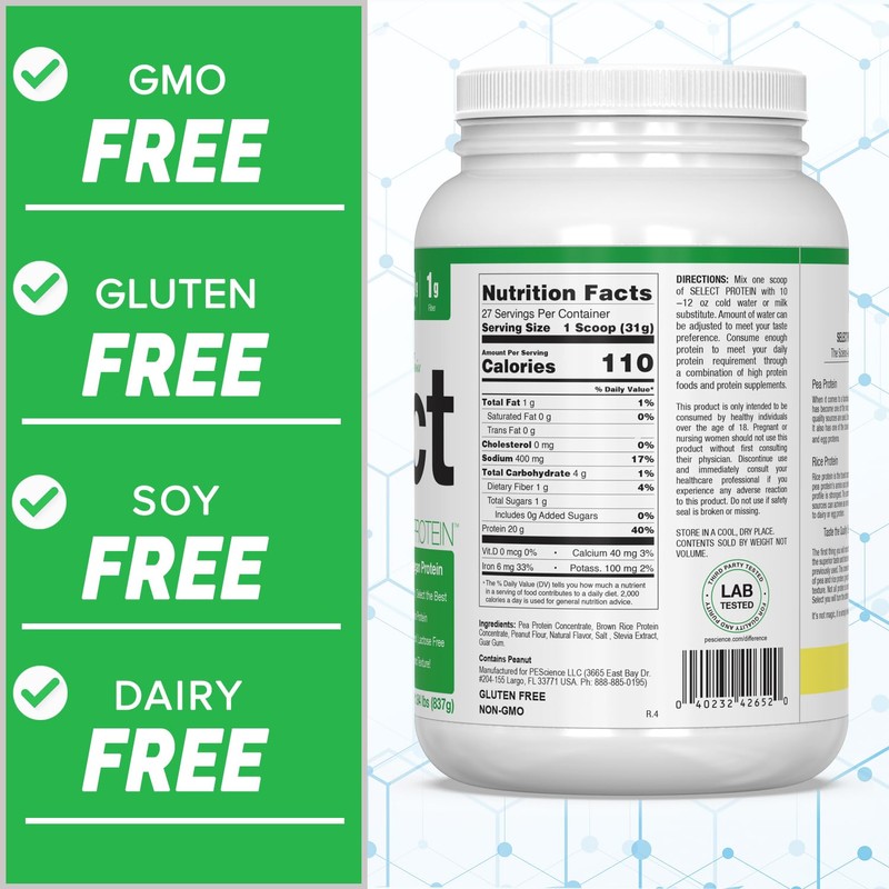 - Premium pea and brown rice protein blend. Select Vegan is a complete protein with a full amino acid profile.