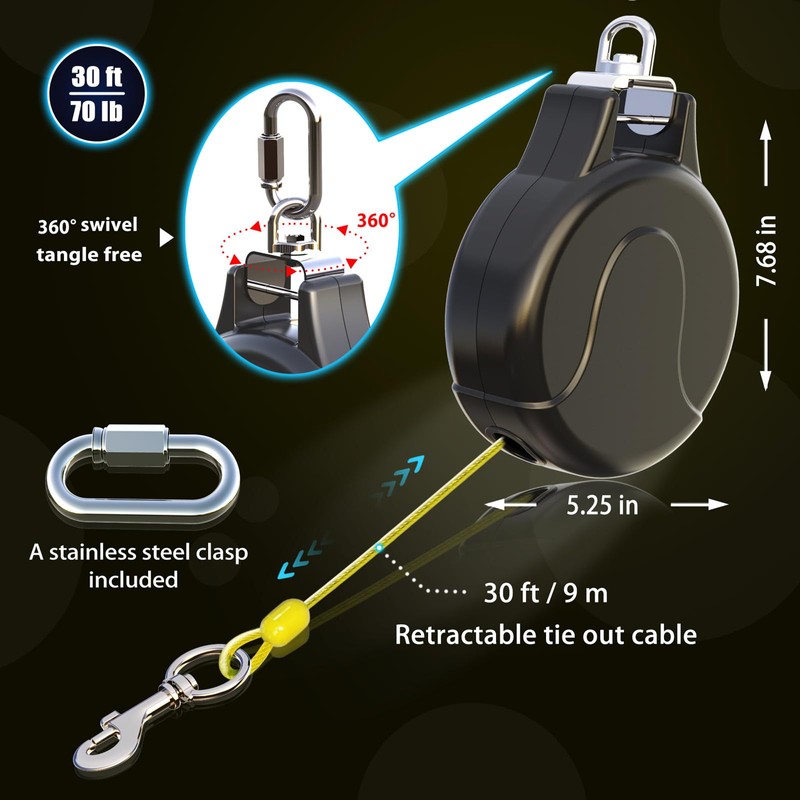 - ❤ NO TANGLE FOR SAFER: The retractable tie out keeps your pet from getting tangled, the tie out automatically rolls up into the housing, makes it safer without getting their legs tangled, hunging, etc.. Also, 360° rotating clasps on the ends equals no more tangled pet or tie out.