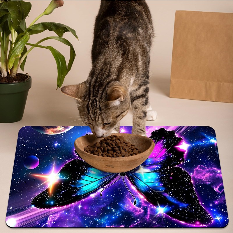 Pet Bowl Mats for Food and Water Cat Dog 19.6"x24", Cat Play Mat Pet Feeding Rug with Waterproof & Non-Slip Rubber Bottom Cushion, Litter Matt for Cat and Pet Sleeping Resting Pad, Star Butterfly