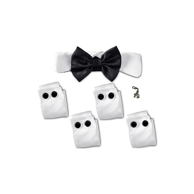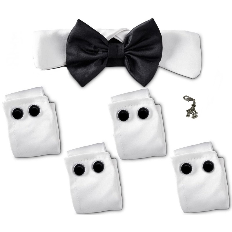 - Small Pet Breeds Pet Costume Wedding Formal Cuff and Bow Tie with Charm 6 pc Set - includes one Bowtie Shirt Collar points and a two pairs of elasticized cuffs with satin covered buttons plus one pet themed charm