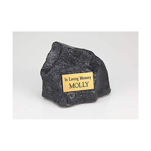 Place your beloved pet's ashes in a Rock Urn. These beautiful poly-resin, reproduction stones can be placed in a flower garden or displayed on your mantel. Designed for the pet owner who prefers to keep their pet's ashes outdoors or the person who just wants a different look in memorials. Each urn is accessible via a bottom threaded screw-plug. Each urn comes with a UV protected outdoor poly nameplate for engraving. This urn comes in a small size for pets 0-20 pounds (live weight). See our other listings for medium through extra large sizes. Please accept our sincere condolences for the loss of your beloved pet and friend.