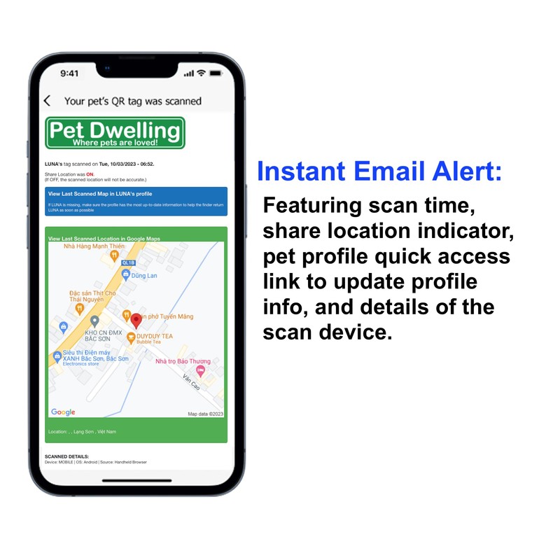 - INSTANT SCAN ALERTS: Get real-time email notifications with scan details and location, plus a pinpoint map on your dog profile page whenever someone scans your dog's tag. Quickly locate your pet if they go missing.