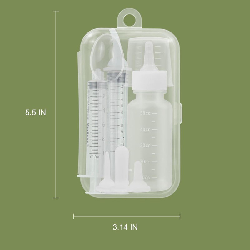- Pet nursing kit includes 1 x 10ml feeding syringe and 1 x 12ml elbow syringe, 5 different sized silicone nipples, 10ml syringe spoon, 50ml kitten bottle, 30ml measuring cup.