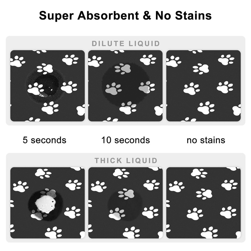 SUPER ABSORBENT & PET-FRIENDLY:Crafted from a magical water-absorbing material, this mat quickly soaks up any water spills, preventing your furry friend from tracking moisture around the house. Your pet will enjoy a neat and dry eating area with this highly absorbent mat.