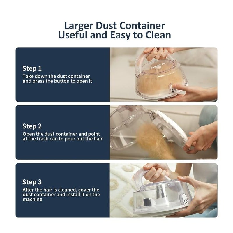 • NOT EASILY CLOGGED: The pet hair vacuum grooming brush adopts a vertical air inlet and a conical 360 degree air inlet metal mesh design, the filter screen will not be clogged, and there is an extended detachable hose. If clogged, the detachable hose can be unblocked, and easy operate with one click to open the cover.