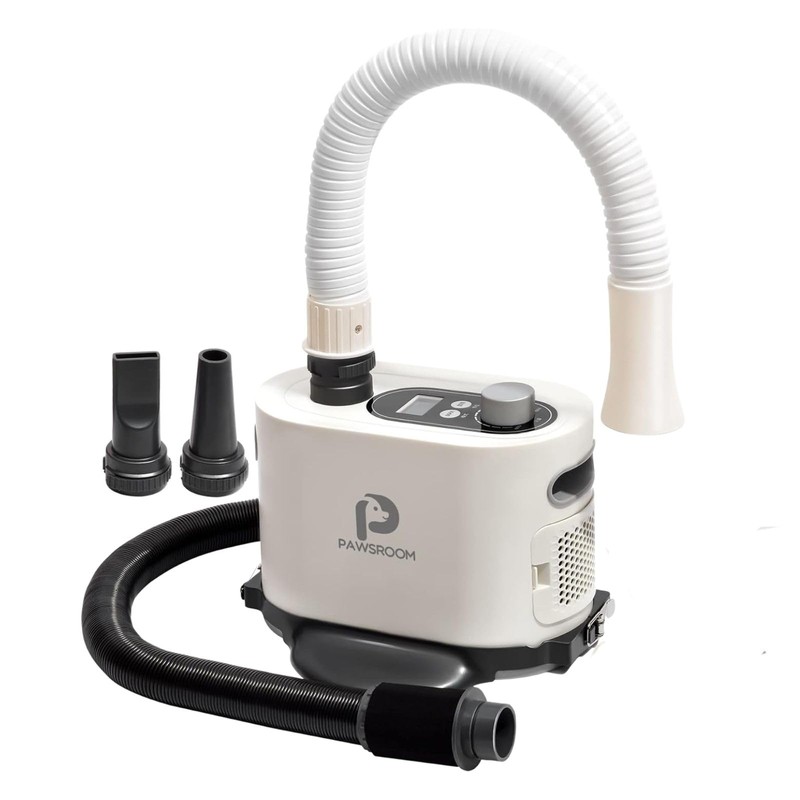 - 【Complete Accessories】The dog hair dryer is equipped with double-pipe fittings, and the hard pipe can be fixed, thus freeing your hands; The hose can be adjusted 360 degrees in angle and height, making it suitable for pets of different sizes. The pet grooming machine is equipped with two nozzles to reduce knots and blow out silky hair. The interior is equipped with a filter element that makes the air blowing clean and comfortable.
