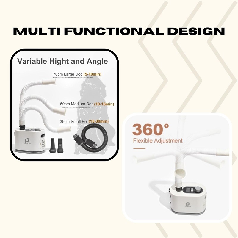 - 【Multi-functional Design】 The pet grooming dryer adopts a vertical design, soft and hard two tubes, which is compatible with personal and commercial use, and even the pet grooming table is directly compatible. Our pet dryers are equipped with LED displays that show real-time wind speed levels. The smart LED panel makes it easy to display wind speed and temperature regulation.