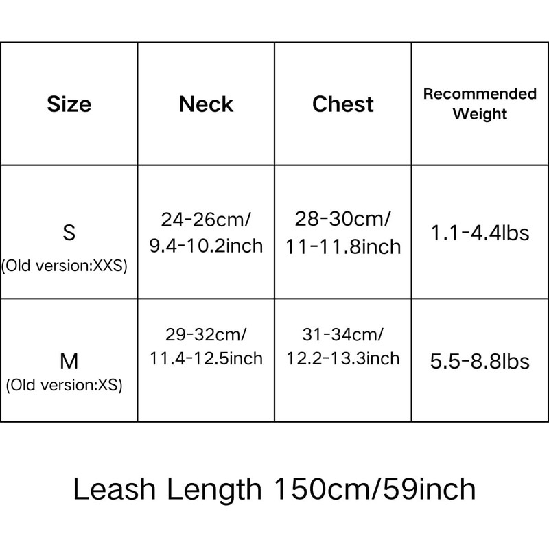 S (old version: XXS) Neck 7.87-9.45",Chest 9.45-11.02",Rope Length 59.06" ,Suitable for 1.1-4.41 lbs
